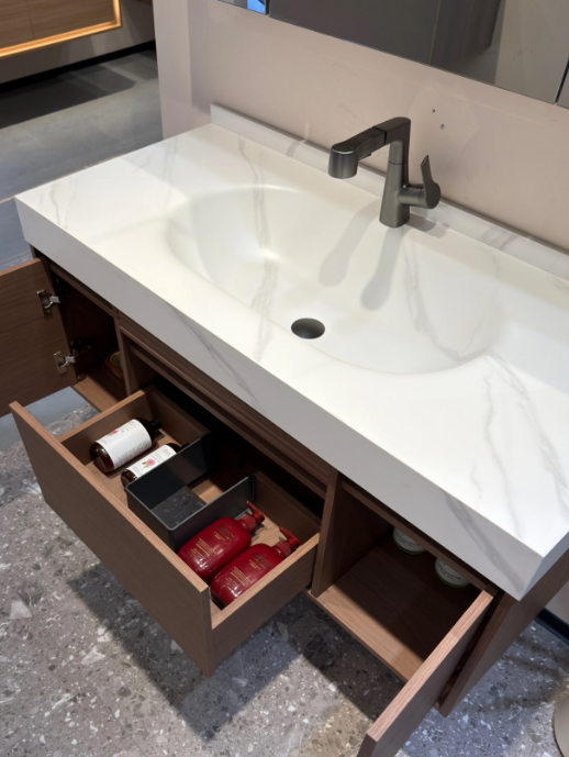 岩板达到莫氏7级硬度,坚硬耐磨,经久耐用,极大提升了浴室柜使用寿命。
